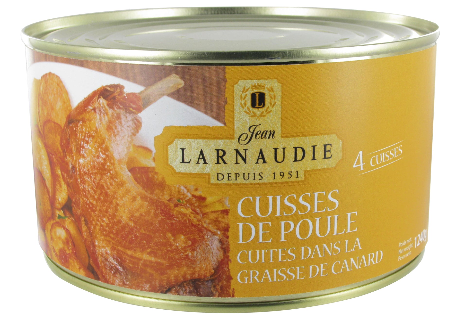 Vier zart gegarte Hähnchenkeulen, traditionell französisch zubereitet und confiert in feinem Entenfett. Diese Spezialität vereint den milden Geschmack von Hähnchen mit der aromatischen Tiefe von Entenfett – ideal für ein unkompliziertes, aber raffiniertes Gericht für die ganze Familie. Hergestellt von Jean Larnaudie – Spezialist für Geflügel-Confit seit 1951.